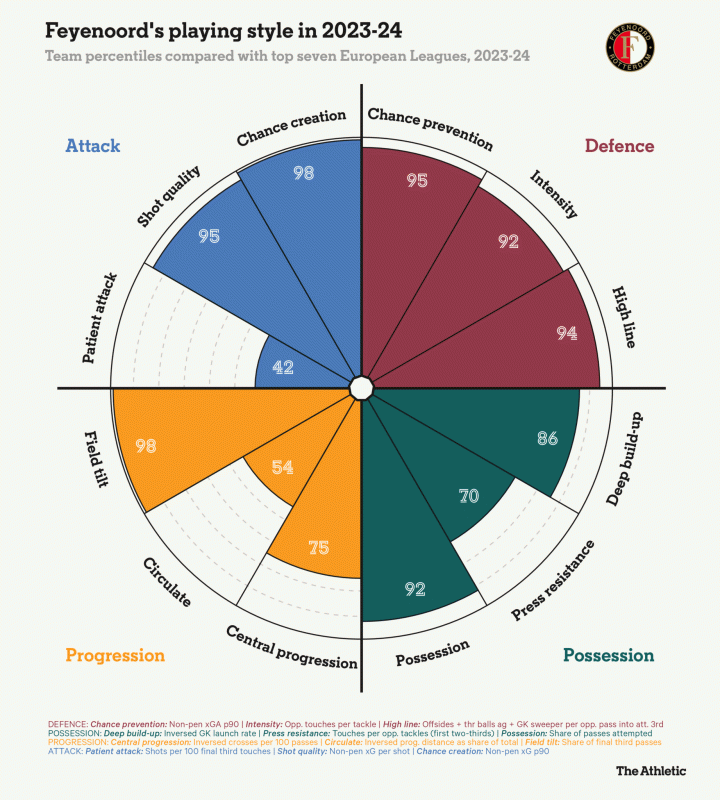 本赛季,费耶诺德场均运动战丢球只有0.73个,在欧洲前七大联赛中,只有葡萄牙体育、尤文图斯、国际米兰和阿森纳防守更出色。