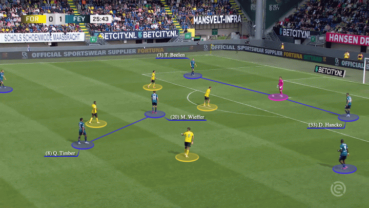 费耶诺德也并非一成不变,他们有多种向进攻三区推进的手段——有时通过渐进式传球实现提速,有时通过横向传递减缓节奏。