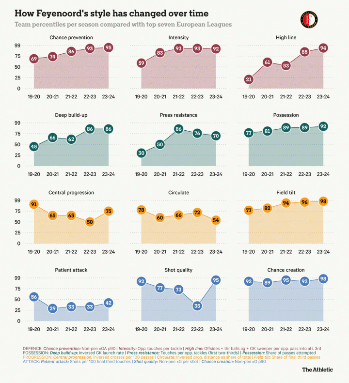 斯洛特对控球能力的关注,并不等于他们执着于通过倒脚消磨时间。相反,费耶诺德的战术风格充满能量且目的明确——如此直接的风格,与克洛普的利物浦非常相似,但他们也不是一支依靠长传的队伍。
