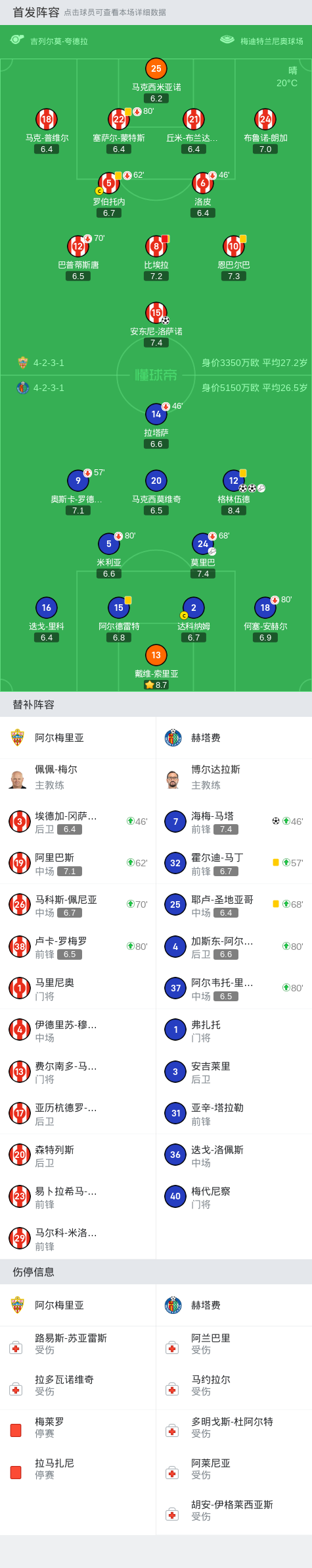 阿尔梅里亚首发:15-安东尼-洛萨诺, 8-比埃拉, 12-巴普蒂斯唐, 10-恩巴尔巴, 21-丘米-布兰达里斯, 22-塞萨尔-蒙特斯, 25-马克西米亚诺, 5-罗伯托内, 24-布鲁诺-朗加, 6-洛皮, 18-马克-普维尔