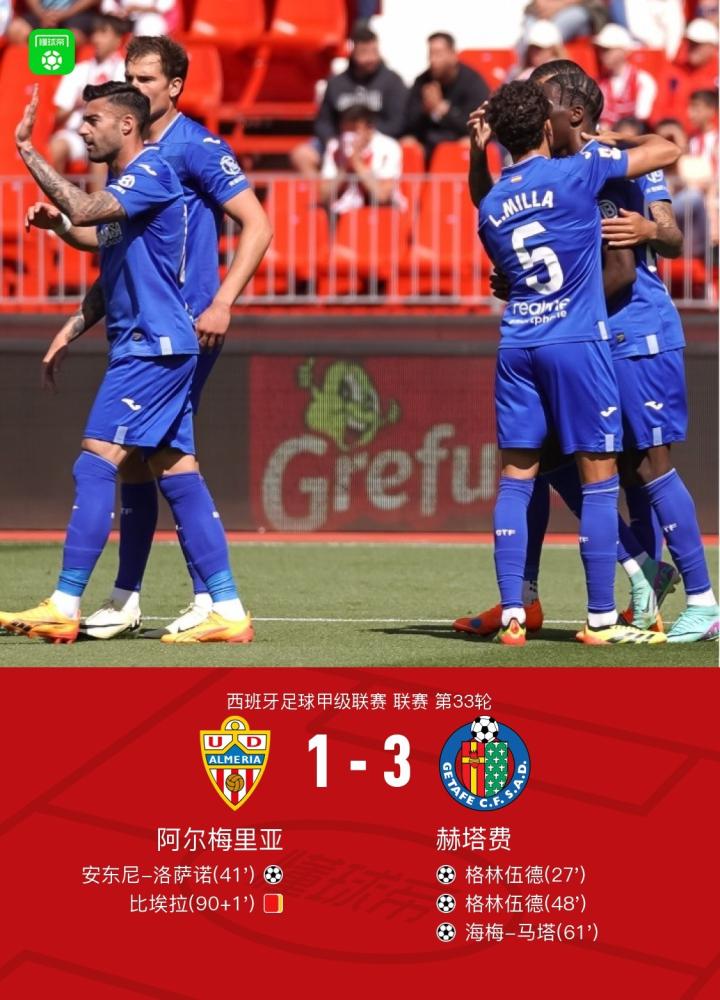 北京时间4月27日,西班牙足球甲级联赛第33轮,阿尔梅里亚在主场迎战赫塔费。比赛中,安东尼-洛萨诺为阿尔梅里亚打入一球。而赫塔费方面,格林伍德攻入两球,海梅-马塔也有一粒入账。最终,赫塔费以3比1战胜阿尔梅里亚。