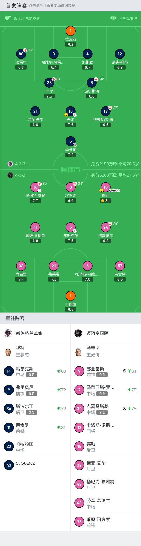 新英格兰革命首发:10-希尔, 88-法雷尔, 28-卡耶, 18-伊曼纽尔-博阿滕, 21-纳乔-希尔, 3-哈维尔-阿雷亚加, 1-拉瓦斯, 8-波尔斯特, 12-尼克-利马, 5-尚卡莱, 4-凯斯勒