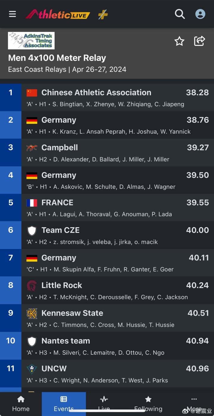 北京时间4月28日,美国佛罗里达东海岸接力赛男子4x100米比赛中,由严海滨、谢震业、吴智强和陈佳鹏组成的中国接力男队以38秒28夺得冠军。