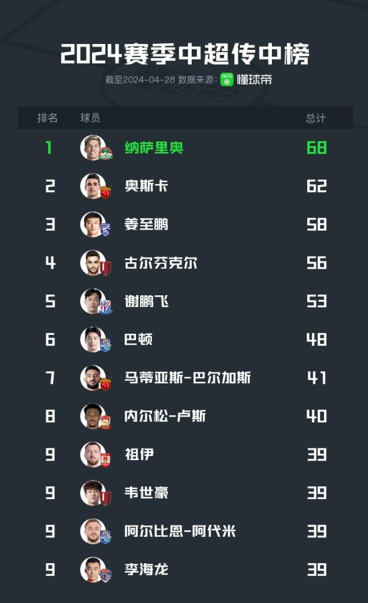 在2024赛季中超前8轮结束后,懂球帝统计出了联赛传中次数以及传中成功次数排名前10位的球员,在传中榜上排名前三的球员分别是纳萨里奥、奥斯卡以及姜志鹏,而在成功传中榜上纳萨里奥同样排名第一,巴顿和马蒂亚斯-巴尔加斯并列第二。