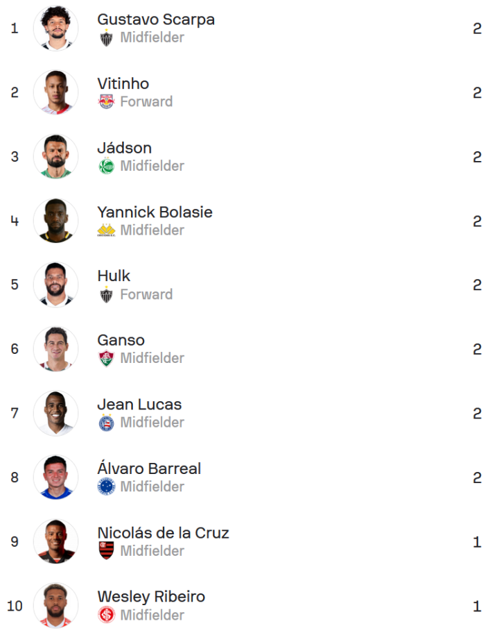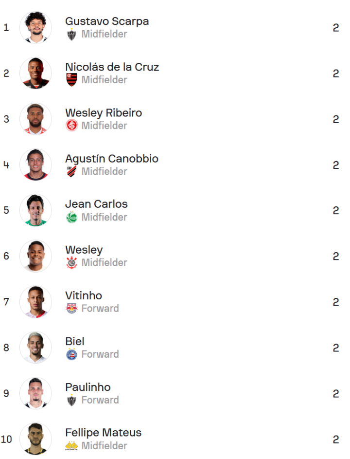 1.韦斯利-特谢拉(14次,科林蒂安)