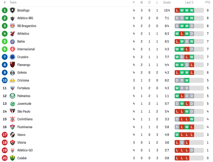 北京时间4月28日-30日,2024赛季巴西足球甲级联赛结束了第4轮的争夺。