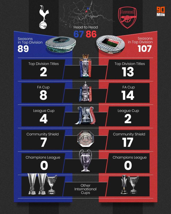 北京时间周日晚21时,本赛季英超联赛第二回复的北伦敦德比将会在托特纳姆热刺的主场打响,赛前英国媒体90min统计并对比了两支球队的荣誉。