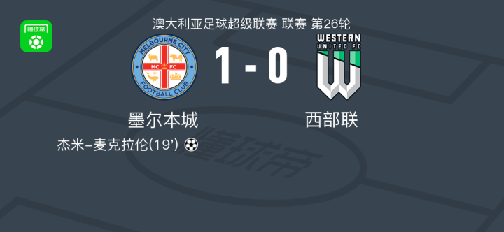 北京时间4月28日澳大利亚足球超级联赛 联赛 第26轮,墨尔本城主场对阵西部联。墨尔本城杰米-麦克拉伦破门。最终比分墨尔本城 1-0 西部联。