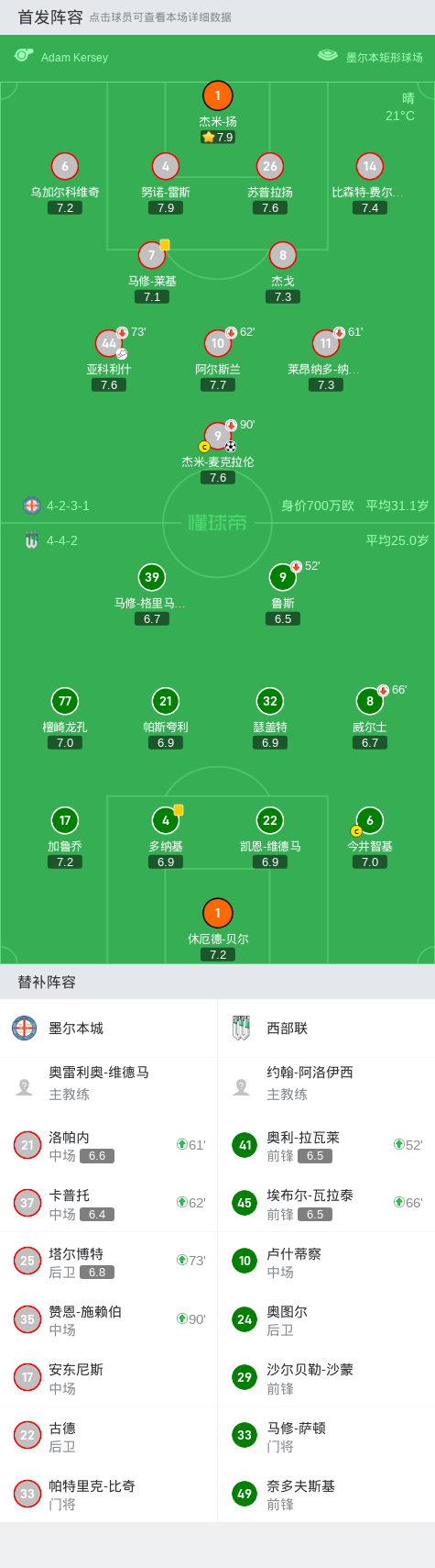 墨尔本城首发:26-苏普拉扬, 1-杰米-扬, 10-阿尔斯兰, 7-马修-莱基, 4-努诺-雷斯, 8-杰戈, 44-亚科利什, 9-杰米-麦克拉伦, 6-乌加尔科维奇, 11-莱昂纳多-纳特尔, 14-比森特-费尔南德斯