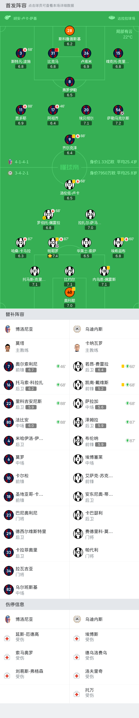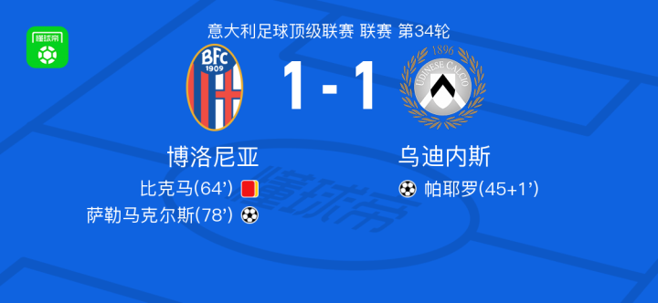 十人博洛尼亚1-1乌迪内斯,帕耶罗破门,萨勒马克尔斯救主