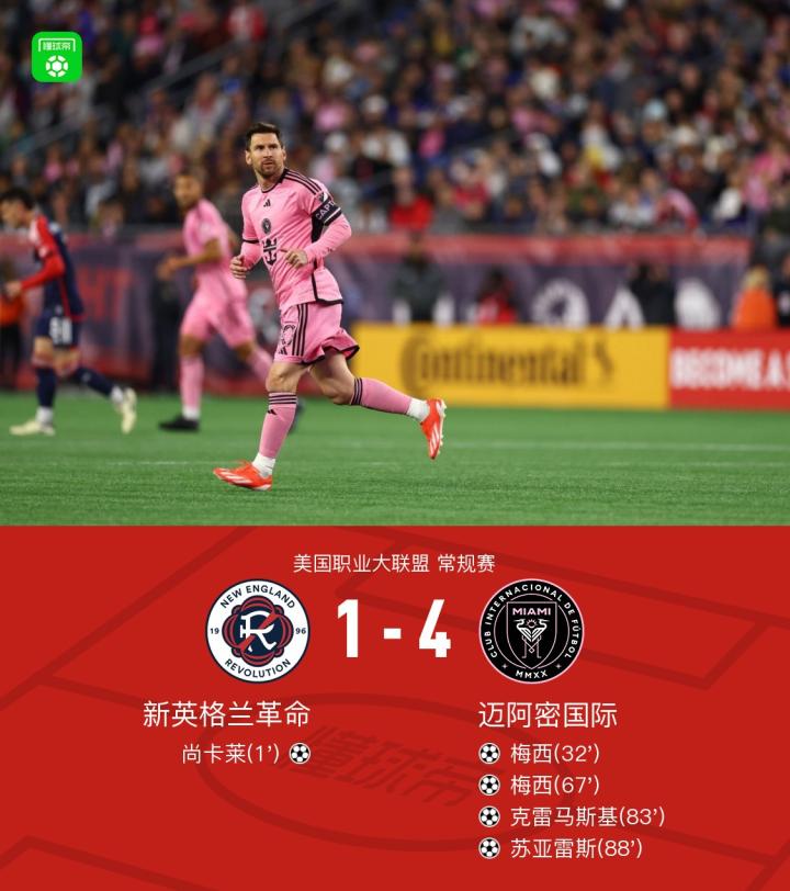 【迈阿密国际客场4-1新英格兰革命,梅西2球1助,苏亚雷斯建功】