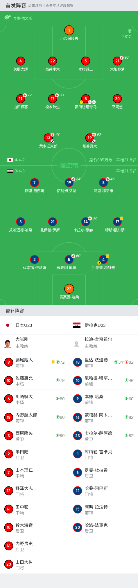 日本U23首发:1-小久保玲央, 5-木村诚二, 19-细谷真大, 8-藤田让瑠奇马, 21-大畑步梦, 13-荒木辽太郎, 11-山田枫喜, 22-高井幸大, 17-松木玖生, 20-平河悠, 4-关根大辉
