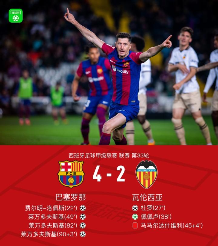 北京时间4月30日,西班牙足球甲级联赛迎来了第33轮的比赛,巴塞罗那在主场迎战瓦伦西亚。上半场,冈萨雷斯单刀打偏,拉菲尼亚助攻费尔明甩头攻门入网,特尔施特根严重失误后杜罗断球空门得手,阿劳霍送点后佩佩卢点射命中,莱万头球攻门中柱,马马尔达什维利禁区外手球被红牌罚下;下半场,京多安角球助攻莱万头球得手,阿劳霍头球后蹭被扑,莱万再次头球破门梅开二度,莱万任意球直接破门戴帽。最终,比赛以巴塞罗那 4-2 瓦伦西亚告终。