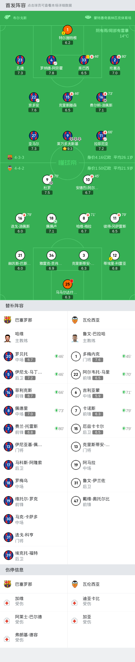 瓦伦西亚首发:18-佩佩卢, 10-安德烈-阿尔梅达, 9-杜罗, 12-蒂埃里-科雷亚, 25-马马尔达什维利, 21-赫苏斯-巴斯克斯, 16-迭戈-洛佩斯, 11-彼得-冈萨雷斯, 3-克里斯蒂安-莫斯克拉, 34-雅雷克-贡肖罗夫斯基, 8-哈维-格拉