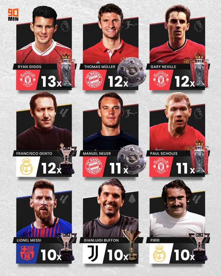在榜单中,吉格斯以13次英超冠军位居首位,曼联92班吉格斯、加里-内维尔、斯科尔斯上榜。穆勒本赛季错失追平吉格斯的机会,下赛季依然有望夺得第13冠,诺伊尔也有望继续扩大自己的冠军数,梅西与布冯也在榜单之上。