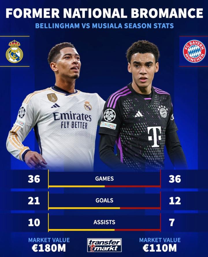 北京时间周三凌晨3时,拜仁慕尼黑主场与皇家马德里的欧冠半决赛首回合比赛就将打响,而两位昔日英格兰青年代表队的队友穆西亚拉和贝林厄姆也将再次在球场上进行较量。
