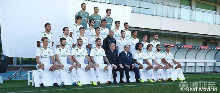 本周一,皇马24名一线队员与主帅齐达内、主席弗洛伦蒂诺以及荣誉主席亨托一起拍摄了全家福。