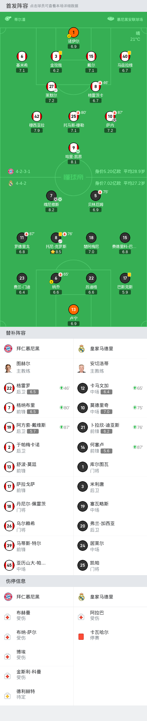 替换下场:76分钟8-托尼-克罗斯, 65分钟6-纳乔, 87分钟11-罗德里戈, 75分钟5-贝林厄姆