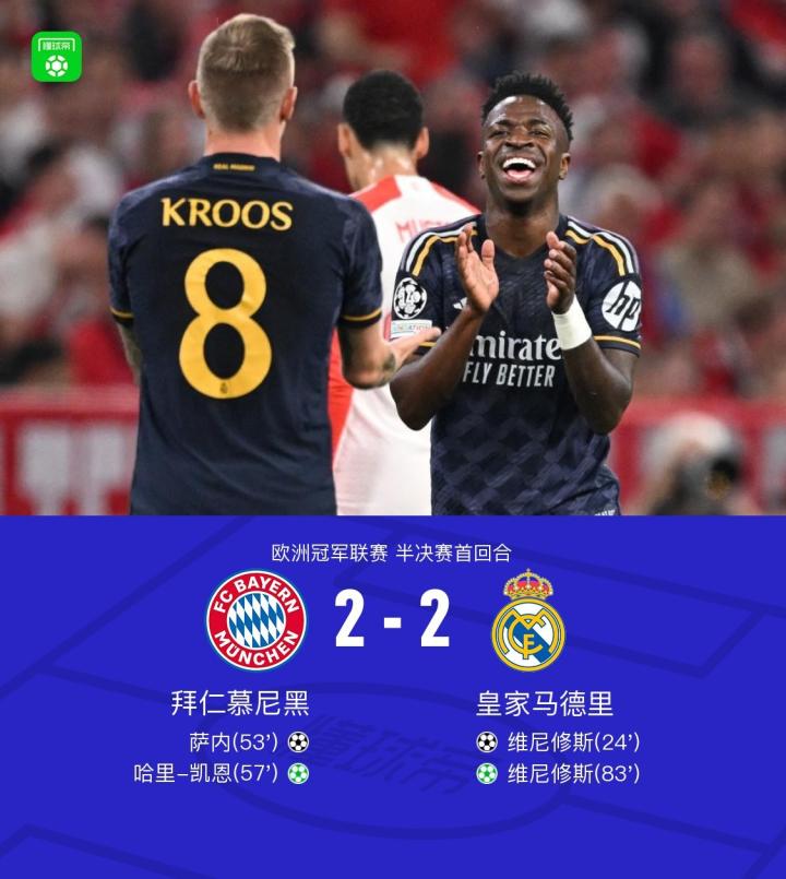 杰士邦|欧冠战报:拜仁2-2皇马,维尼修斯梅开二度救主
