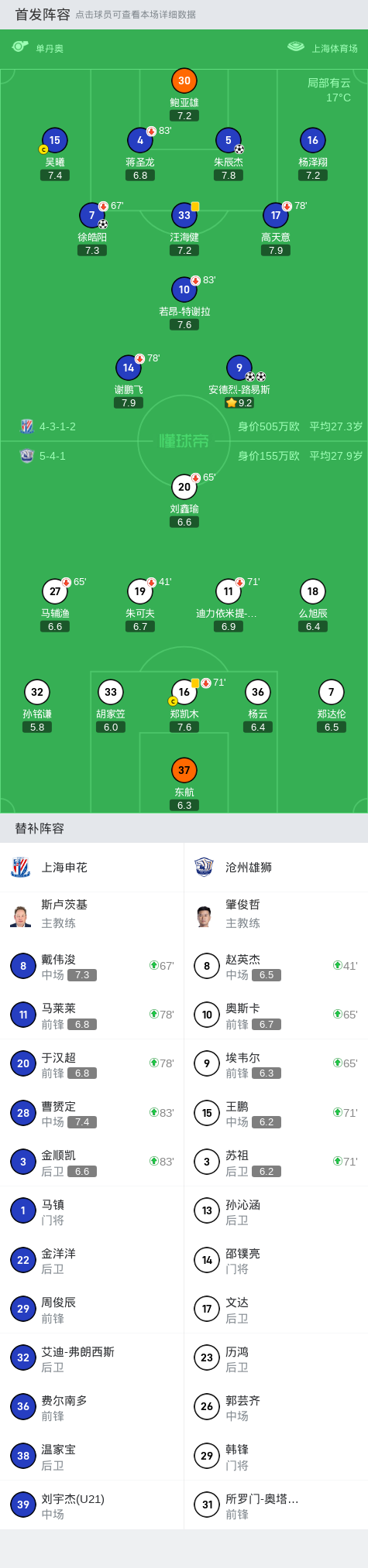 替换下场:83分钟10-若昂-特谢拉, 78分钟14-谢鹏飞, 78分钟17-高天意, 83分钟4-蒋圣龙, 67分钟7-徐皓阳