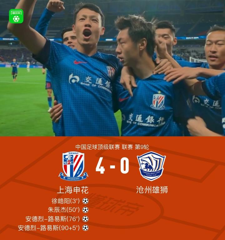 申花4-0沧州,朱辰杰世界波,路易斯双响,曹赟定一条龙助攻