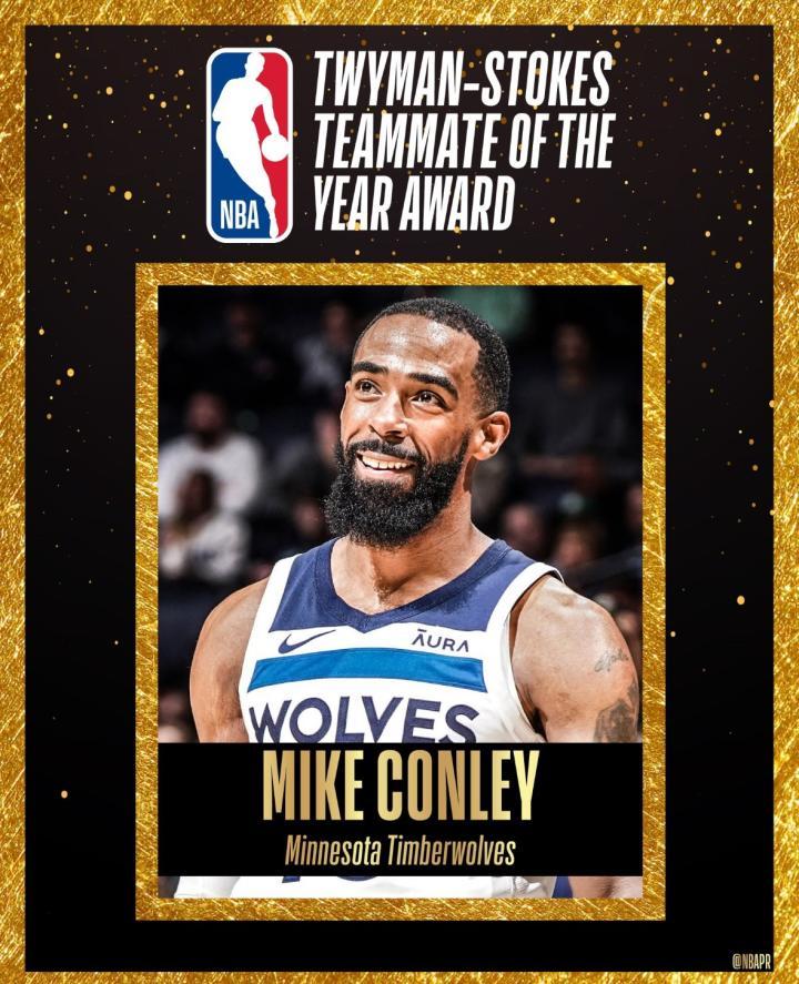 北京时间5月2日,根据NBA官方的消息,森林狼后卫迈克-康利荣获2023-24赛季“特怀曼-斯托克斯”年度最佳队友奖。