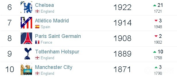 与上期排名相比,榜单前十名的球队中巴塞罗那升至第二名,摩纳哥跌出前十名,曼城则升至榜单的第十名。
