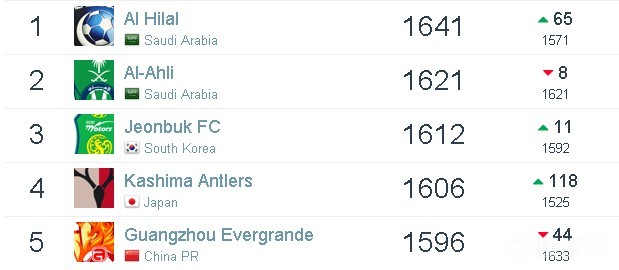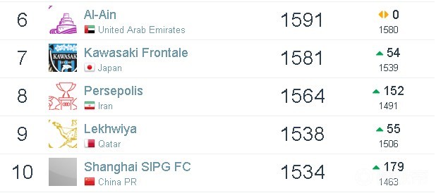 亚洲排名1-10位的依次是:阿尔希拉尔、阿尔阿赫利、全北现代、鹿岛鹿角、广州恒大淘宝、阿尔艾因、川崎前锋、波斯波利斯、莱赫维亚、上海上港。