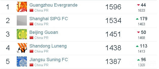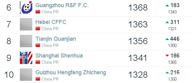 亚洲方面,与上期相比,亚洲榜单的前十名没有发生变化。广州恒大淘宝排在亚洲第5名,世界排名较上期上升3个名次,排在第111名。上海上港排在亚洲第10位,世界排名是第201名。
