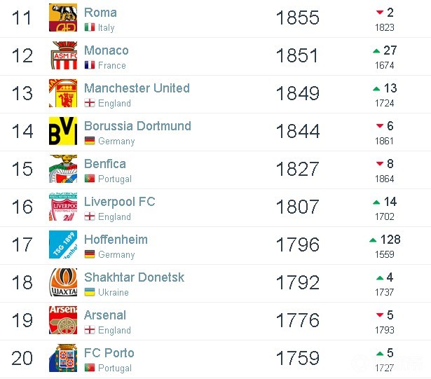 排名11-20位的分别是:罗马、摩纳哥、曼联、多特蒙德、本菲卡、利物浦、霍芬海姆、顿涅茨克矿工、阿森纳以及波尔图。