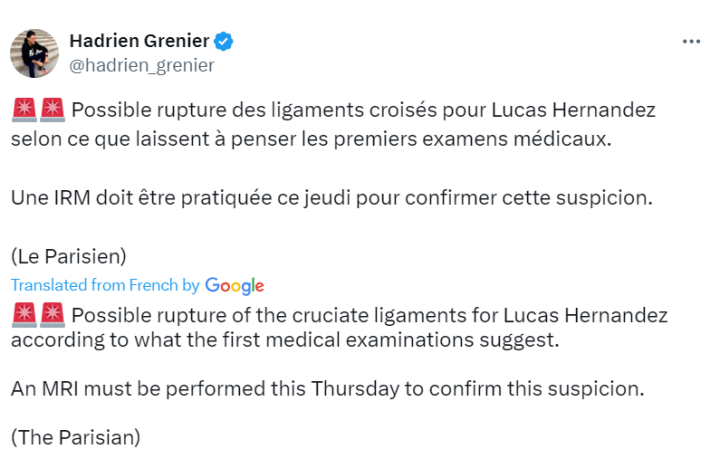 不幸的消息:卢卡斯-埃尔南德斯可能再次十字韧带撕裂