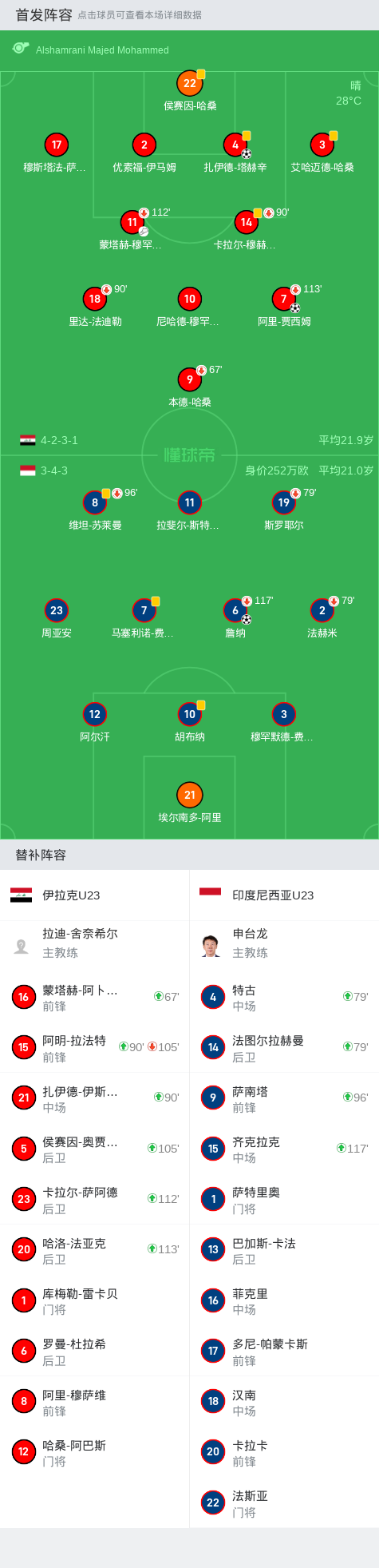 替换下场:112分钟11-蒙塔赫-穆罕默德, 90分钟18-里达-法迪勒, 113分钟7-阿里-贾西姆, 90分钟14-卡拉尔-穆赫塔尔, 67分钟9-本德-哈桑