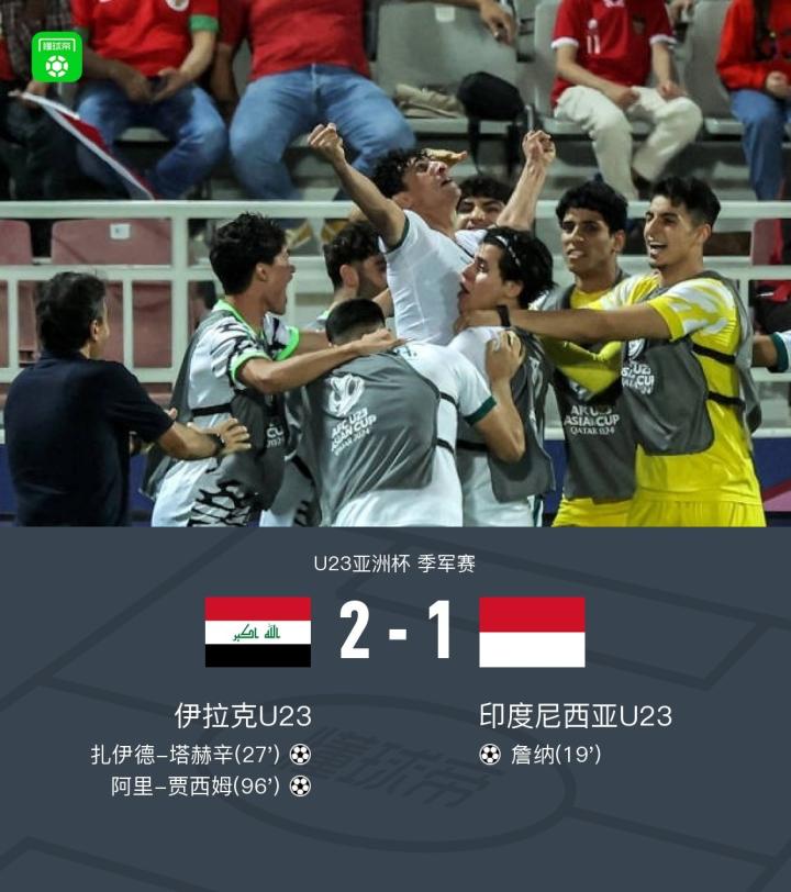 北京时间5月2日U23亚洲杯季军赛,伊拉克U23对阵印度尼西亚U23。上半场詹纳远射破门打破僵局,塔赫辛乱战中头球破门扳平比分;下半场尼哈德-穆罕默德小角度打空门被周亚安门线解围,塔赫辛头球攻门顶偏险些绝杀,常规时间双方战成1-1平,比赛进入加时赛,阿里-贾西姆小角度破门杀死比赛。最终伊拉克U23 2-1逆转战胜印度尼西亚U23,获得了奥运会参赛权。