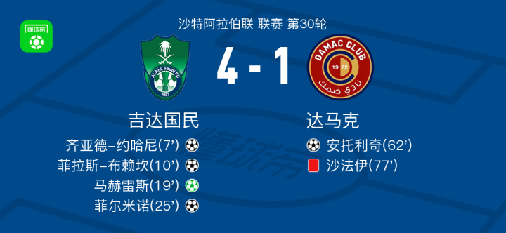 在5月3日的沙特阿拉伯联赛第30轮比赛中,吉达国民主场迎战达马克。齐亚德-约哈尼、菲拉斯-布赖坎、菲尔米诺和马赫雷斯分别为吉达国民队攻入进球,而达马克的安托利奇也有一次精彩的进球。最终比分是吉达国民 4-1 达马克。