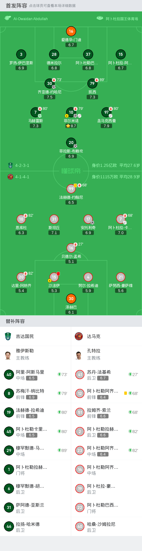 吉达国民首发:10-菲尔米诺, 7-马赫雷斯, 16-爱德华-门迪, 97-圣马克西曼, 79-凯西, 15-阿卜杜拉-阿马尔, 28-德米拉尔, 20-菲拉斯-布赖坎, 3-罗热-伊巴涅斯, 37-阿卜杜勒巴西特-欣迪, 30-齐亚德-约哈尼