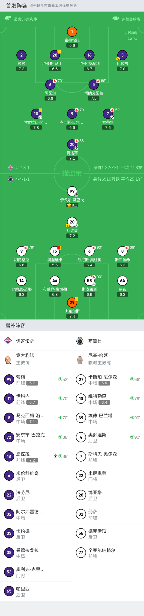 佛罗伦萨3-2十人布鲁日,索蒂尔、恩佐拉、贝洛蒂破门