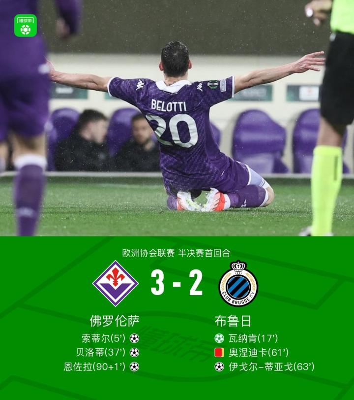 北京时间5月3日欧洲协会联赛 半决赛首回合,佛罗伦萨主场对阵布鲁日。上半场,索蒂尔内切射门得分先拔头筹,比拉吉手球判点,瓦纳肯主罚命中扳平比分。贝洛蒂背身拿球转身射门将比分再次超出。下半场,奥涅迪卡吃到两黄被罚下,伊戈尔-蒂亚戈偷袭成功扳平比分。夸梅冲撞门将,比拉吉进球无效。恩佐拉补时阶段破门锁定胜局。最终佛罗伦萨主场3-2战胜十人布鲁日,取得首回合胜利。