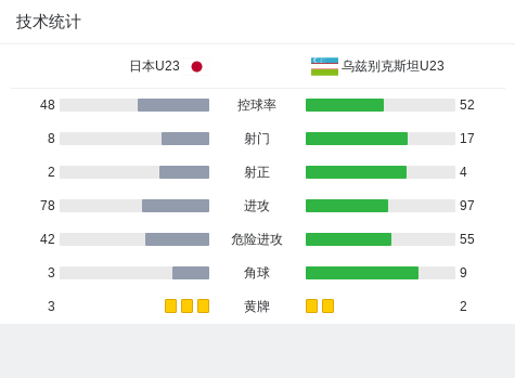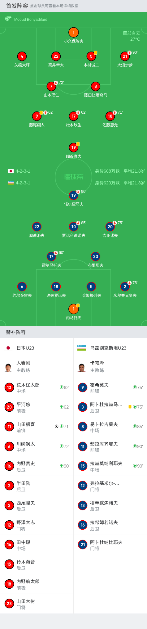 乌兹别克斯坦U23首发:1-内马托夫, 10-贾诺利迪诺夫, 6-约尔多舍夫, 17-霍尔马托夫, 2-米尔赛义多夫, 19-诺尔查耶夫, 18-达夫罗诺夫, 23-布里耶夫, 20-吉亚诺夫, 22-奥迪洛夫, 5-哈姆拉列夫