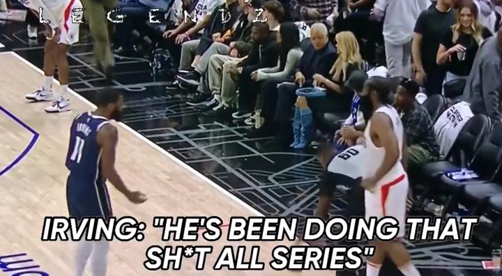 随后欧文冲着裁判说到:“嘿!他这个系列赛一直在做这种狗屎动作。这不是在打篮球。”随后欧文还模仿了哈登仰头制造犯规的动作。