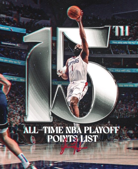 此役,快船球星哈登连续迎来生涯里程碑,在季后赛助攻数升至历史第十后,哈登的季后赛生涯总得分来到3757分,超越奥拉朱旺升至历史第15位。