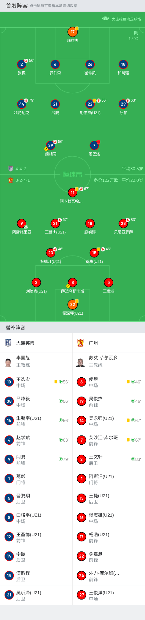 替换下场:56分钟39-阎相闯, 63分钟29-孙铂, 79分钟44-科特尼克, 56分钟2-张振, 56分钟22-毛伟杰