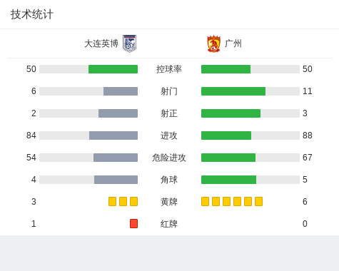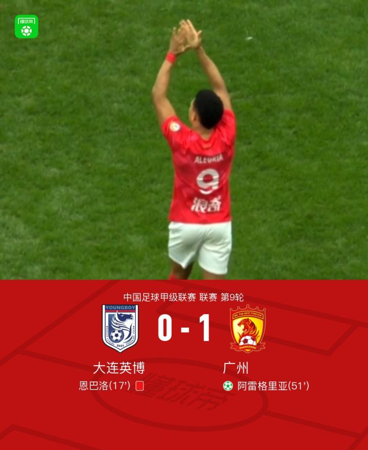 北京时间5月4日中国足球甲级联赛联赛第9轮,大连英博主场对阵广州。比赛第17分钟,恩巴洛肘击染红,第51分钟,阿雷格里亚点射破门。最终比分大连英博0-1广州。