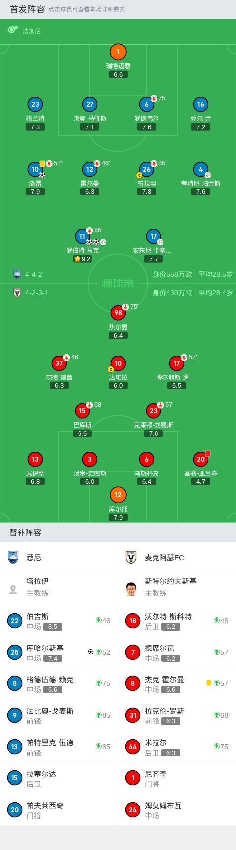悉尼首发:1-瑞德迈恩, 6-罗德韦尔, 23-格兰特, 26-布拉坦, 11-罗伯特-马克, 17-安东尼-卡塞雷斯, 10-洛雷, 16-乔尔-金, 4-考特尼-珀金斯, 12-霍尔曼, 27-海登-马修斯