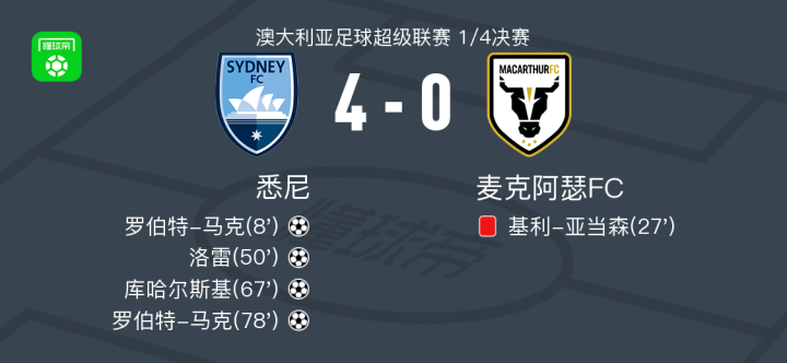 北京时间5月4日澳大利亚足球超级联赛 1/4决赛,悉尼主场对阵麦克阿瑟FC。悉尼罗伯特-马克梅开二度,洛雷破门,库哈尔斯基破门。最终比分悉尼 4-0 麦克阿瑟FC。