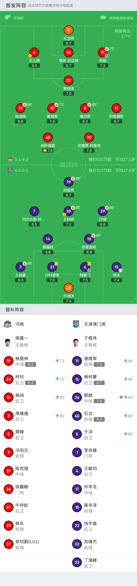 替换下场:90+3分钟8-德尼奇, 75分钟15-刘斌, 73分钟10-黄紫昌, 90+3分钟13-徐浩峰