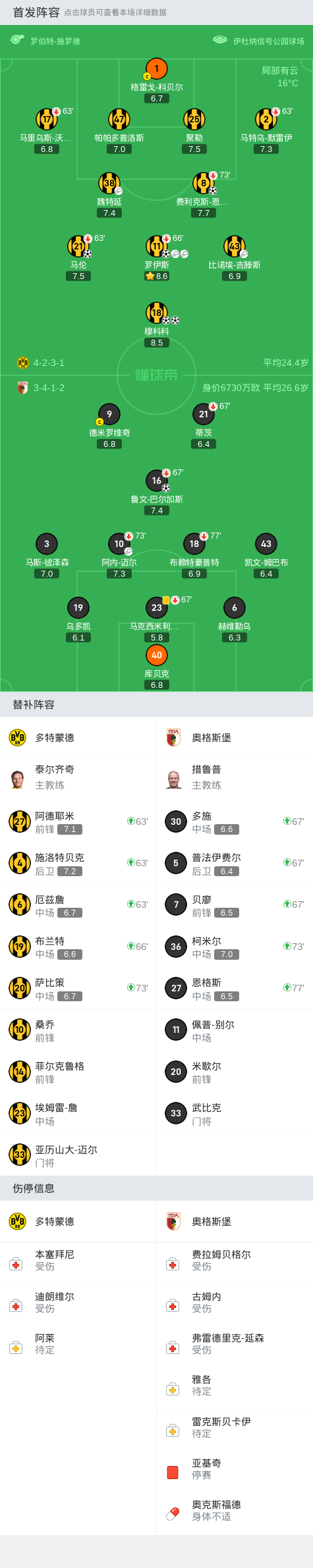 多特蒙德首发:11-罗伊斯, 25-聚勒, 17-马里乌斯-沃尔夫, 1-格雷戈-科贝尔, 2-马特乌-默雷伊, 21-马伦, 47-帕帕多普洛斯, 8-费利克斯-恩梅加, 18-穆科科, 43-比诺埃-吉滕斯, 38-魏特延