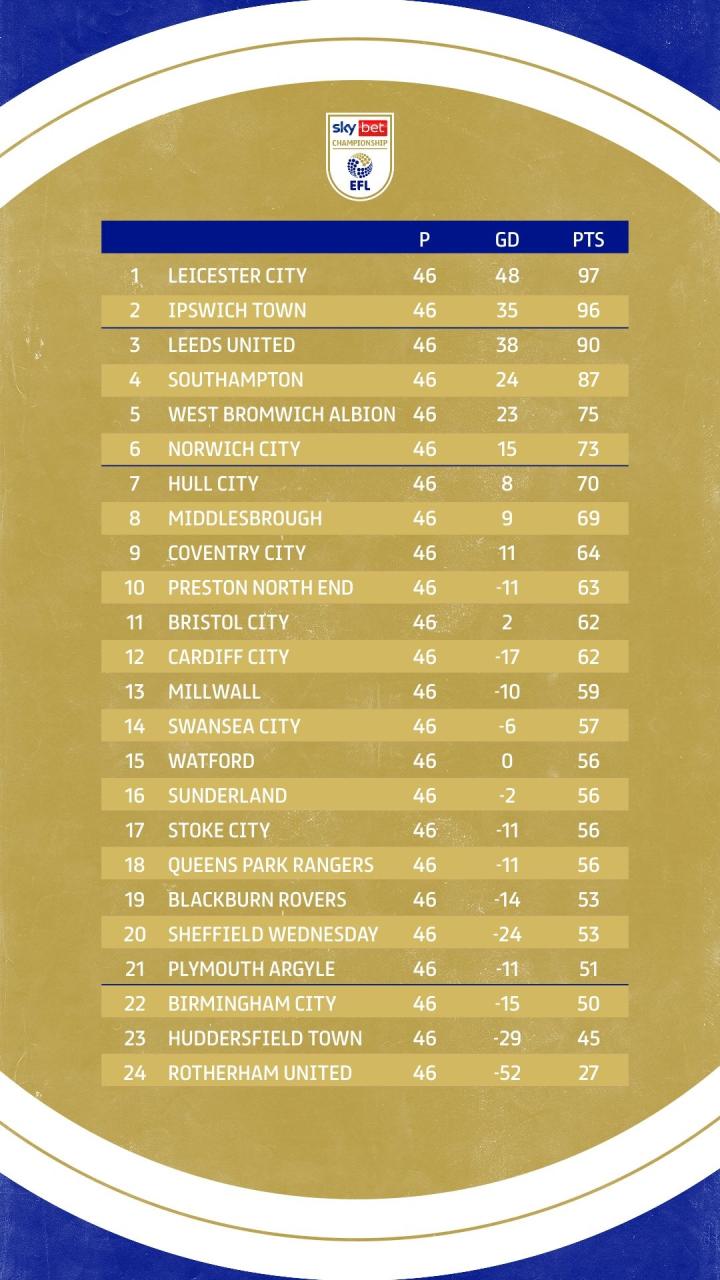 本赛季英冠联赛迎来了大结局,46轮战罢莱斯特城和伊普斯维奇以前两名的成绩直接升入英超,利兹联、南安普顿、西布朗以及诺维奇将通过附加赛决出最后一个升级名额。