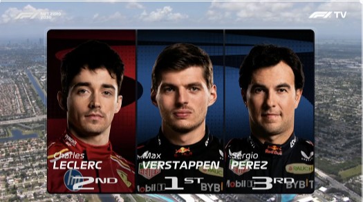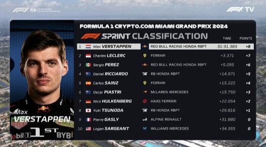 F1迈阿密冲刺赛战报:维斯塔潘夺冠,勒克莱尔亚军,周冠宇11