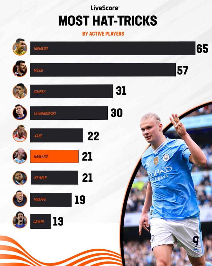 现役球员帽子戏法榜:哈兰德21次追平内马尔,并列第六