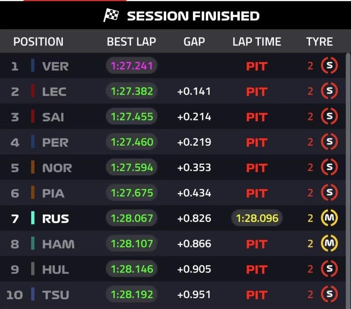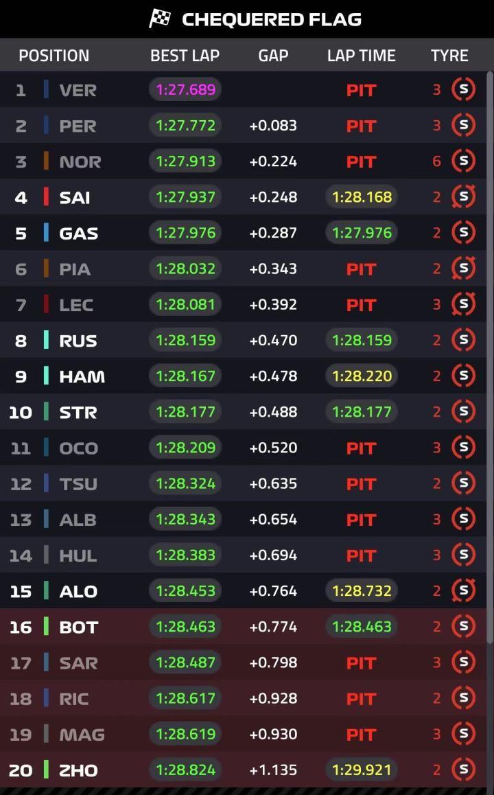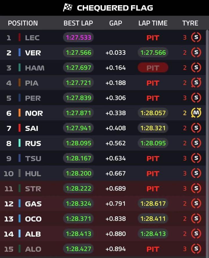 维斯塔潘最终排名第一,勒克莱尔、塞恩斯分列二、三位,之后的选手依次是佩雷斯、诺里斯、皮亚斯特里、拉塞尔、汉密尔顿、霍肯伯格和角田裕毅。